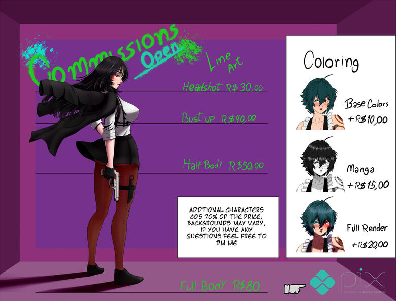 O PREÇO BASE É R$130 PARA UM FULL BODY E UM HEADSHOT. VOCÊ PODE ADICONAR MAIS ELEMENTOS NA SUA SHEET SE QUISER, APENAS TENHA EM MENTE QUE ISSO VAI IMPACTAR NO PREÇO.